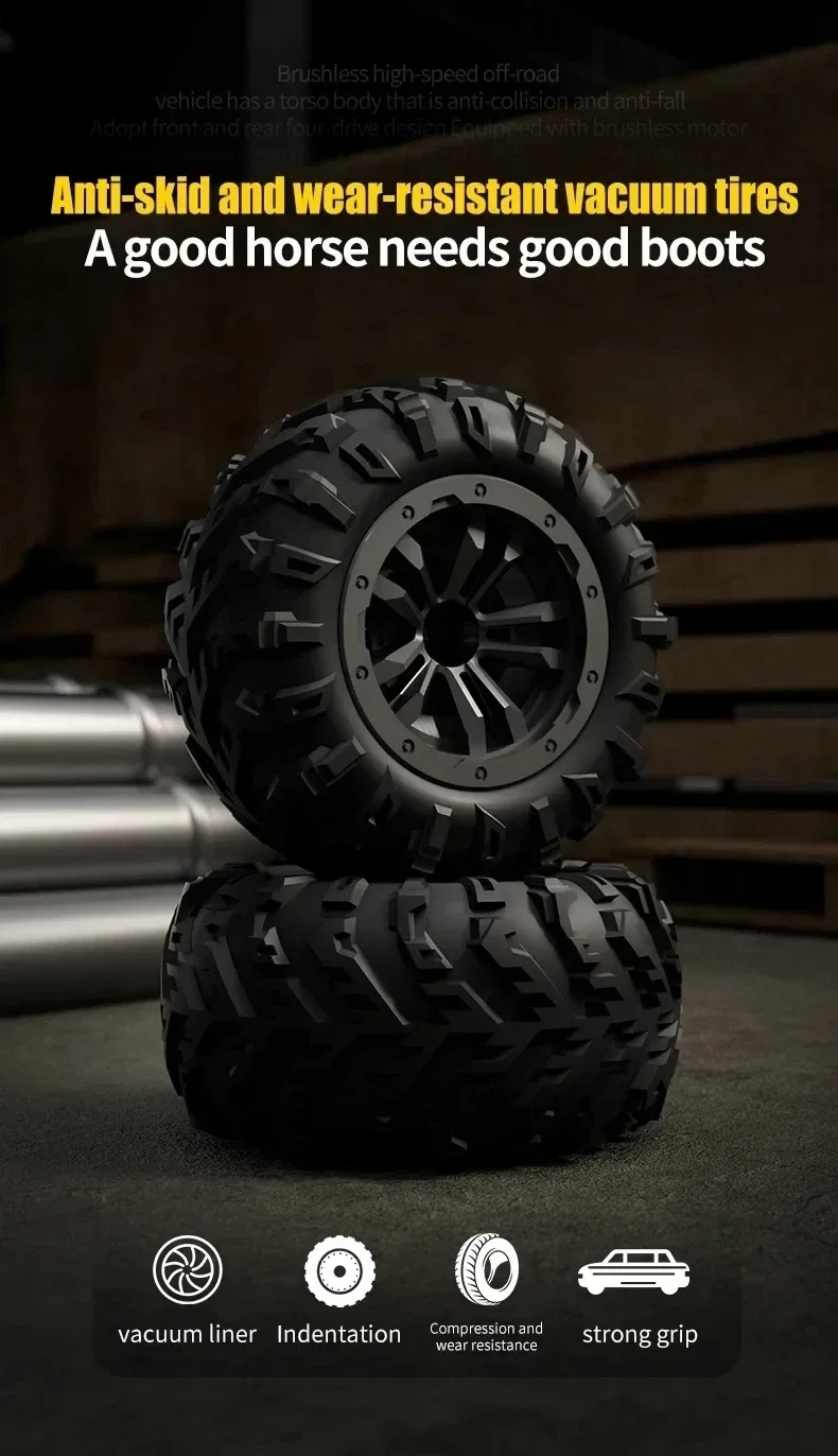Crafted with a high-toughness, explosion-proof PVC car shell and metal second floor, metal front and rear arms, and a metal drive shaft, this RC car is built to withstand the rigors of intense play. The brushless motor provides efficient power delivery and long-lasting durability, ensuring that you can enjoy your hobby for longer periods. The 17G steering gear of the fifth line offers precise control, allowing you to navigate complex obstacles with ease.