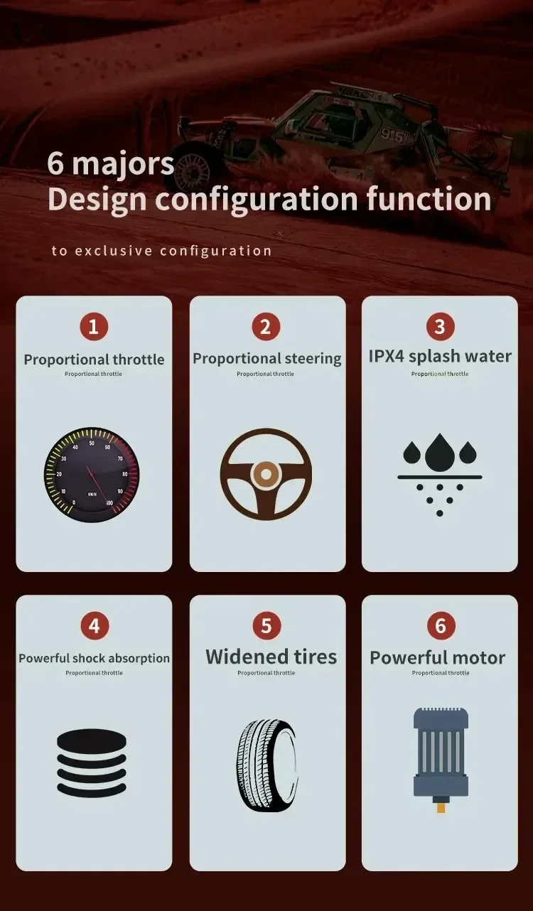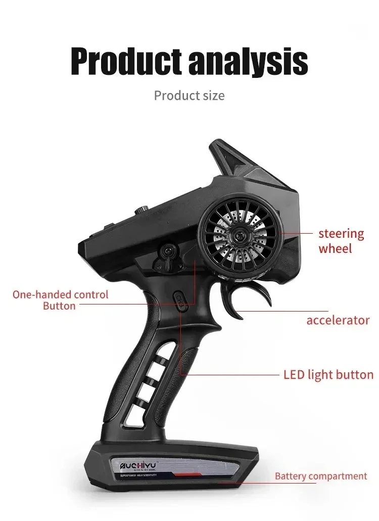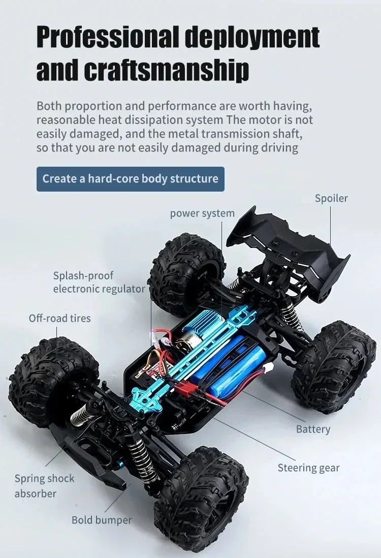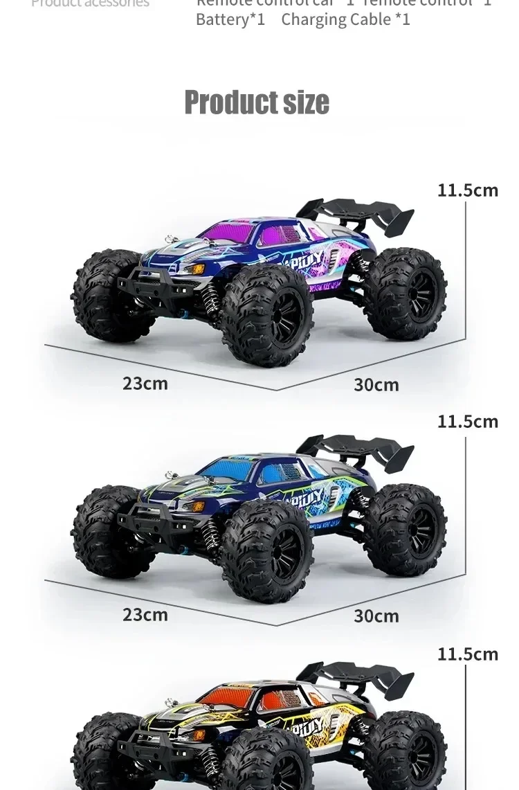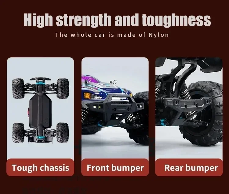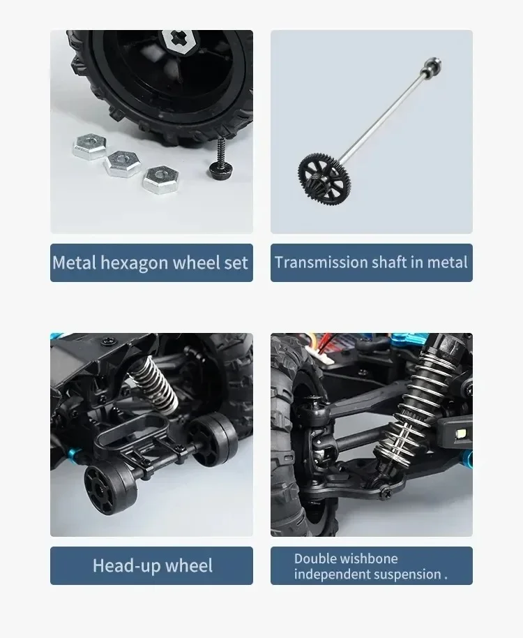 The SCY16101 16102 16103 PRO 4WD 1:16 RC CAR is not just about speed; it's also about adaptability. Whether you're racing on a flat surface, sandy terrain, muddy paths, or grass, this car is designed to perform. The inclusion of a LED headlight with three-gear modes (steady on, slow blinking, fast blinking) adds an extra layer of safety and visibility during nighttime or low-light conditions. The car also comes with a head wheel for added stability and a simulation big foot tire for strong grip, ensuring that you can tackle any environment with confidence.