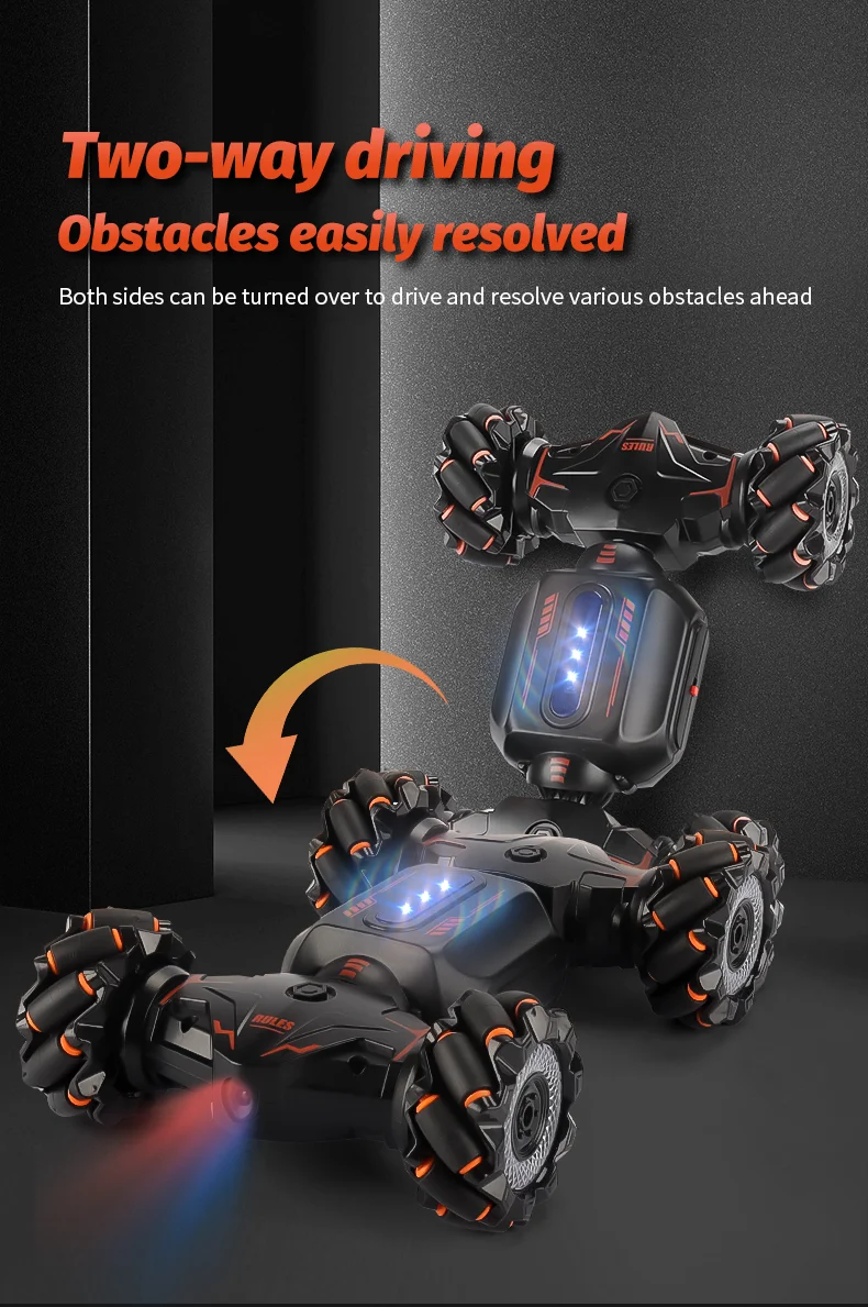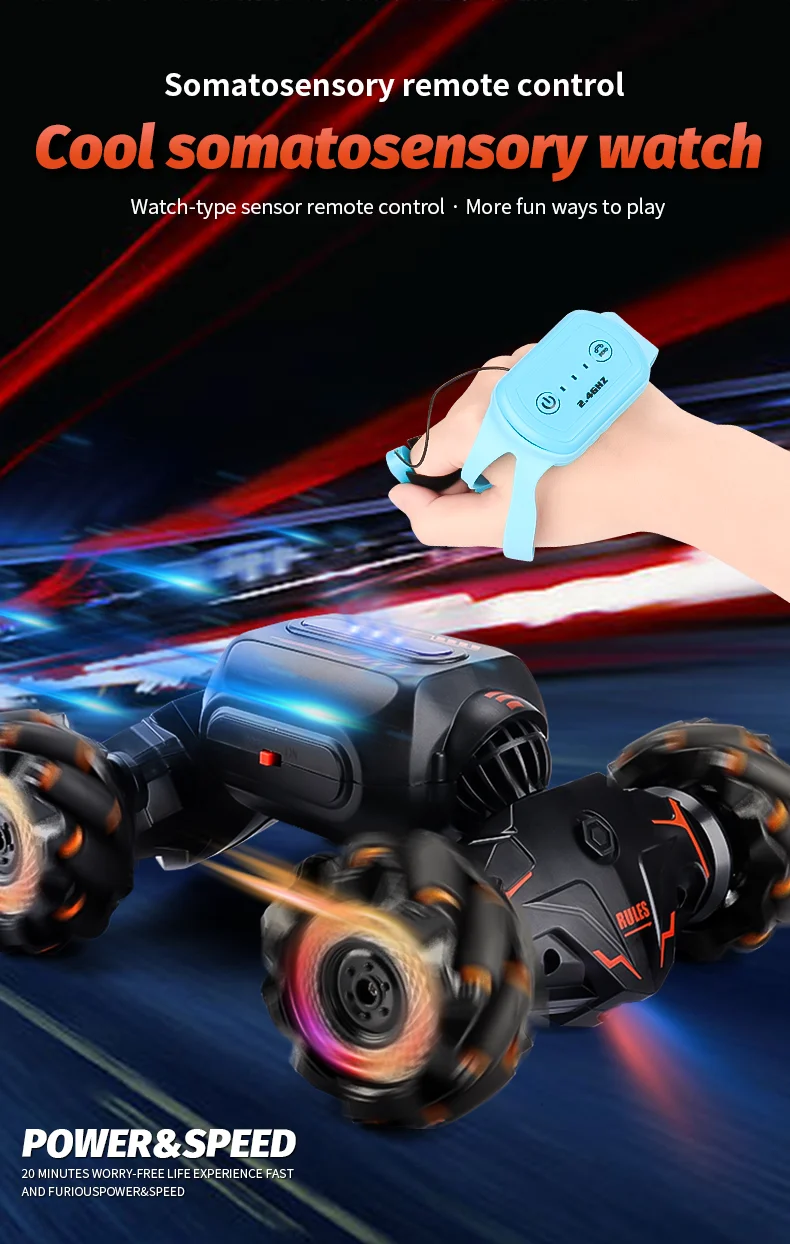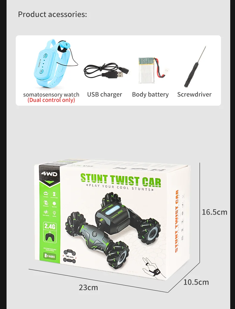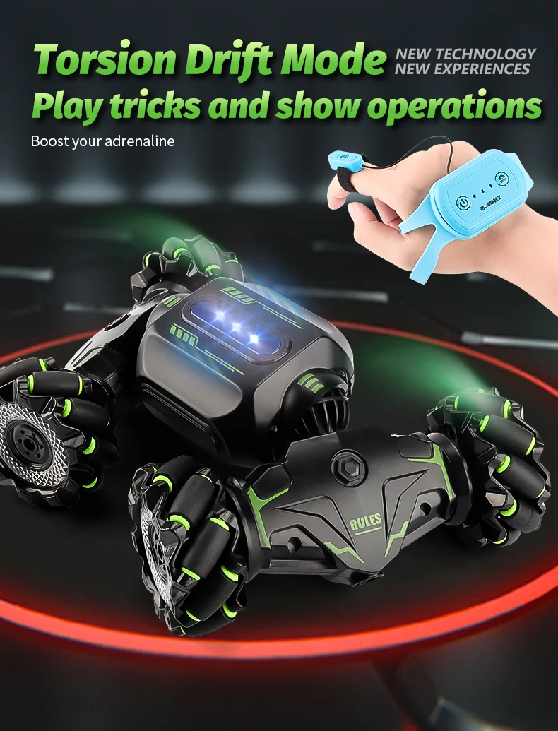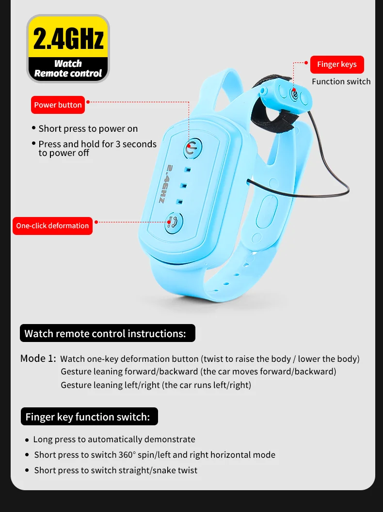 Function: Body remote control twist, four-wheel drive, omnidirectional driving, forward/backward/left rotation/right rotation/left lateral movement/right lateral movement/twisting/twisting drift/snake dance mode. The watch remote control support gesture gravity control. Sound effects, colorful lights, deformation. Suitable for a variety of ground.