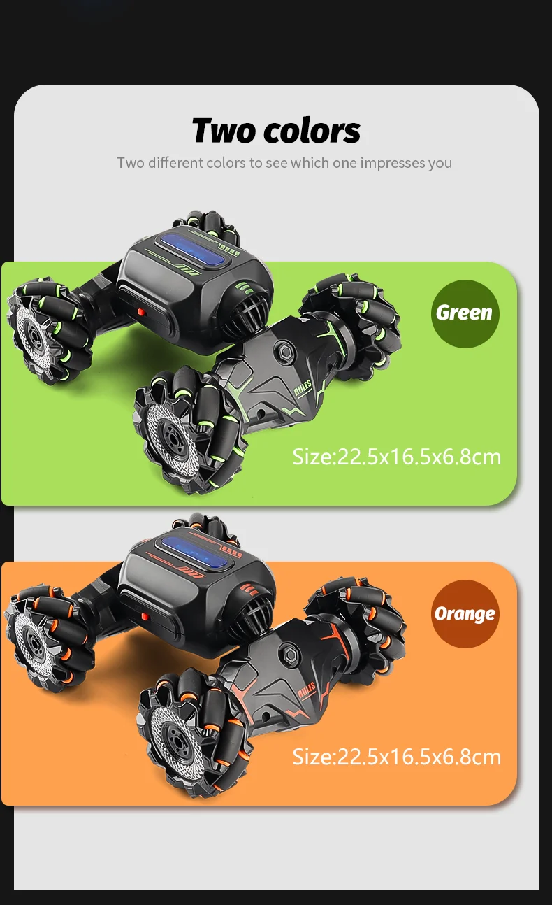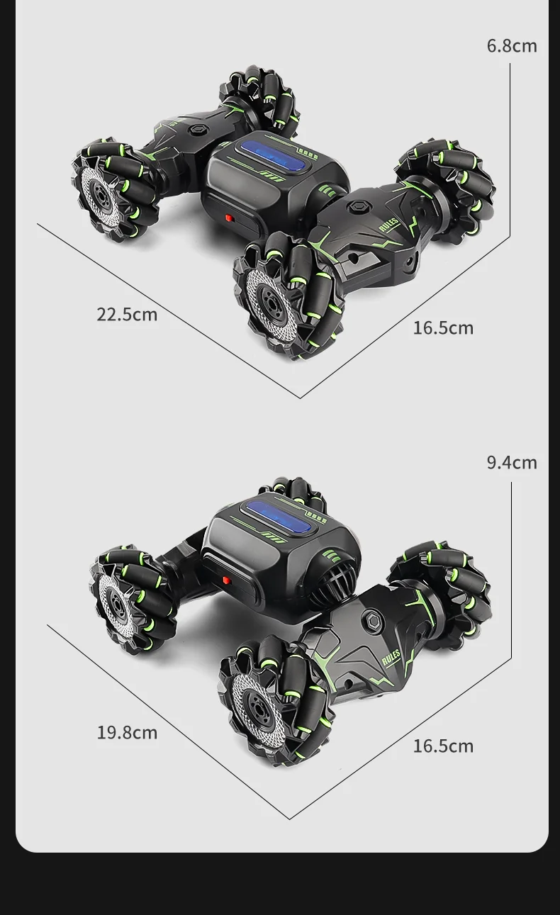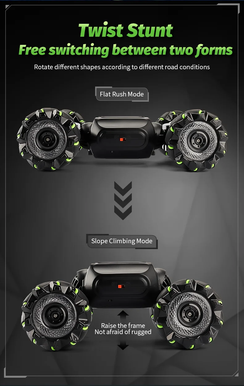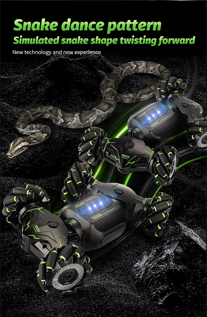 Function: Body remote control twist, four-wheel drive, omnidirectional driving, forward/backward/left rotation/right rotation/left lateral movement/right lateral movement/twisting/twisting drift/snake dance mode. The watch remote control support gesture gravity control. Sound effects, colorful lights, deformation. Suitable for a variety of ground.