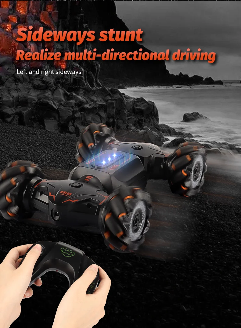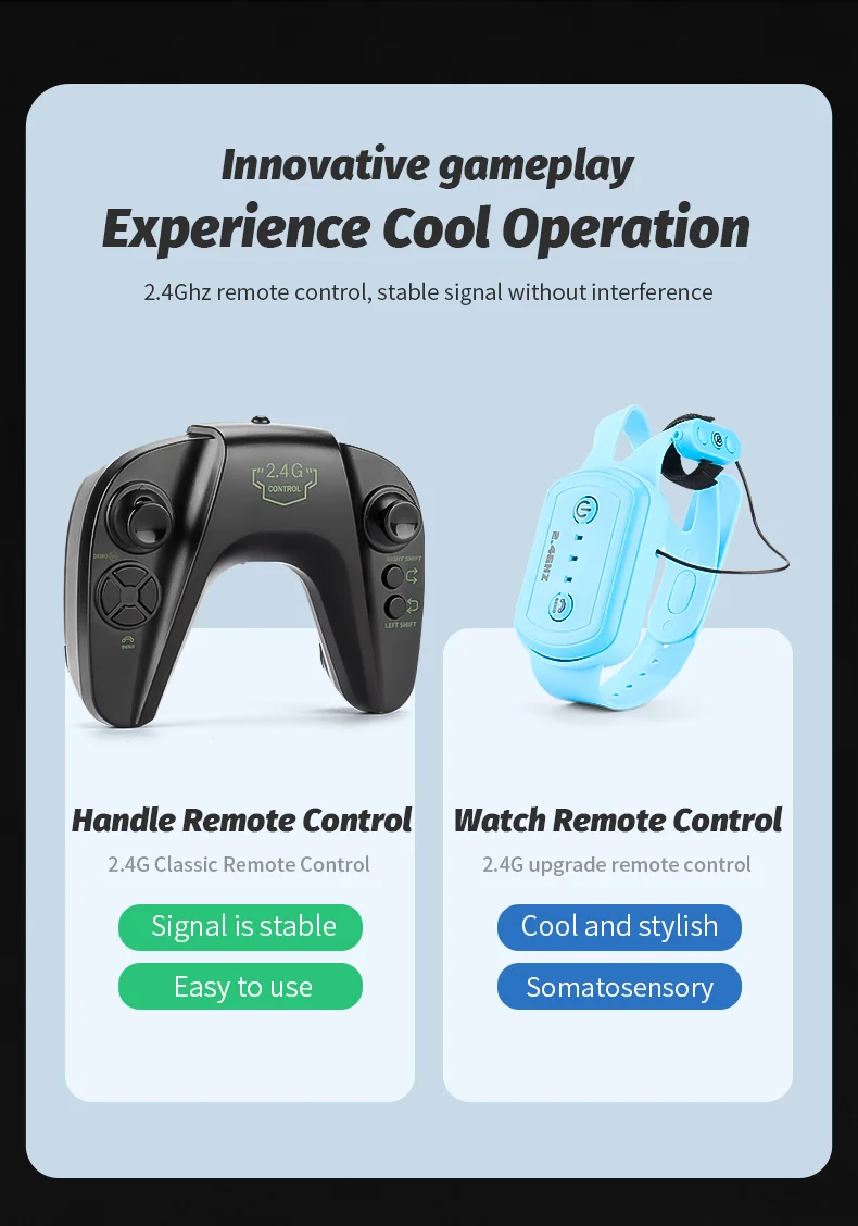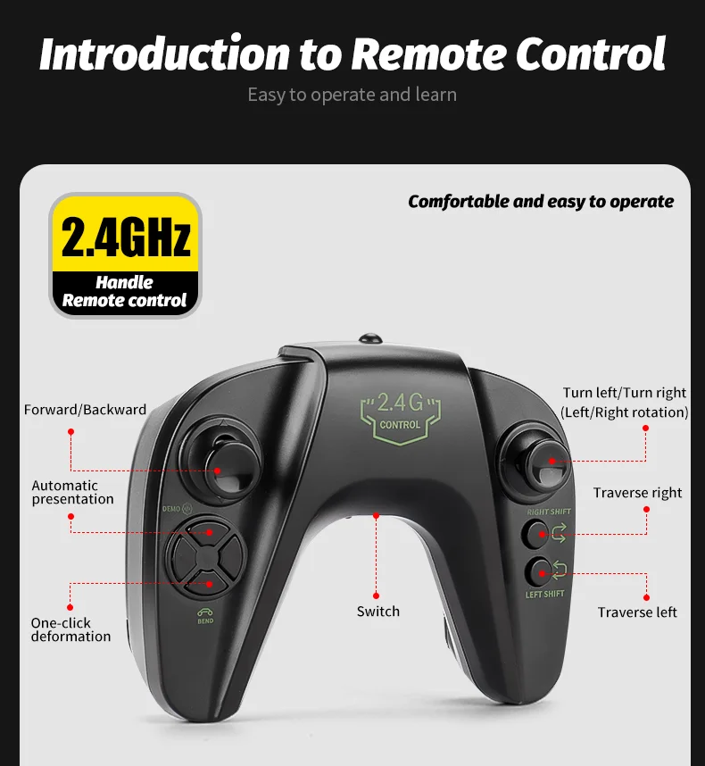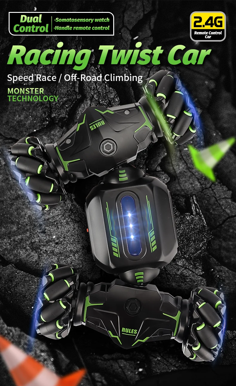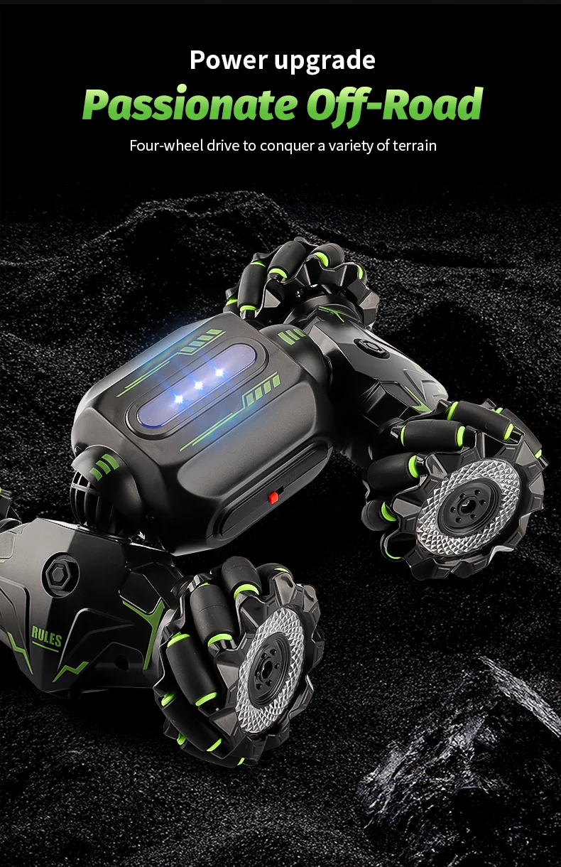 Function: Body remote control twist, four-wheel drive, omnidirectional driving, forward/backward/left rotation/right rotation/left lateral movement/right lateral movement/twisting/twisting drift/snake dance mode. The watch remote control support gesture gravity control. Sound effects, colorful lights, deformation. Suitable for a variety of ground.