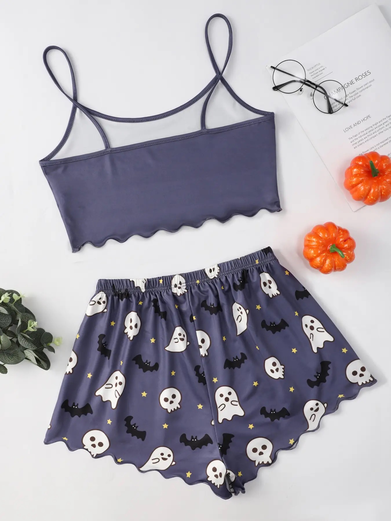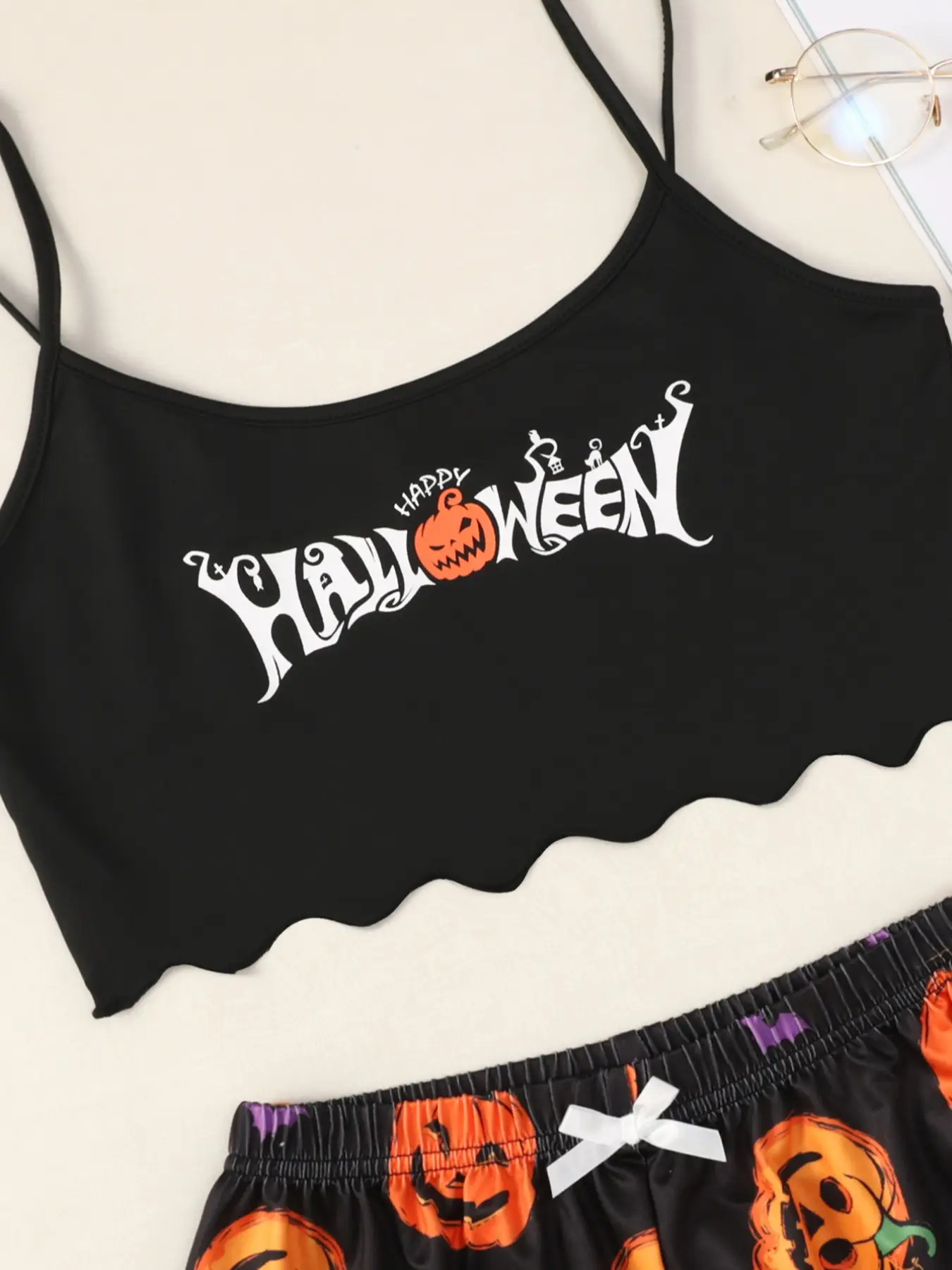 The set includes a sleeveless spaghetti-strap camisole top and matching elastic-waist shorts, both featuring a fun and vibrant pumpkin print that celebrates the spirit of Halloween in style. Made from soft, breathable, and lightweight fabric, it ensures all-night comfort while keeping you stylish and cute.