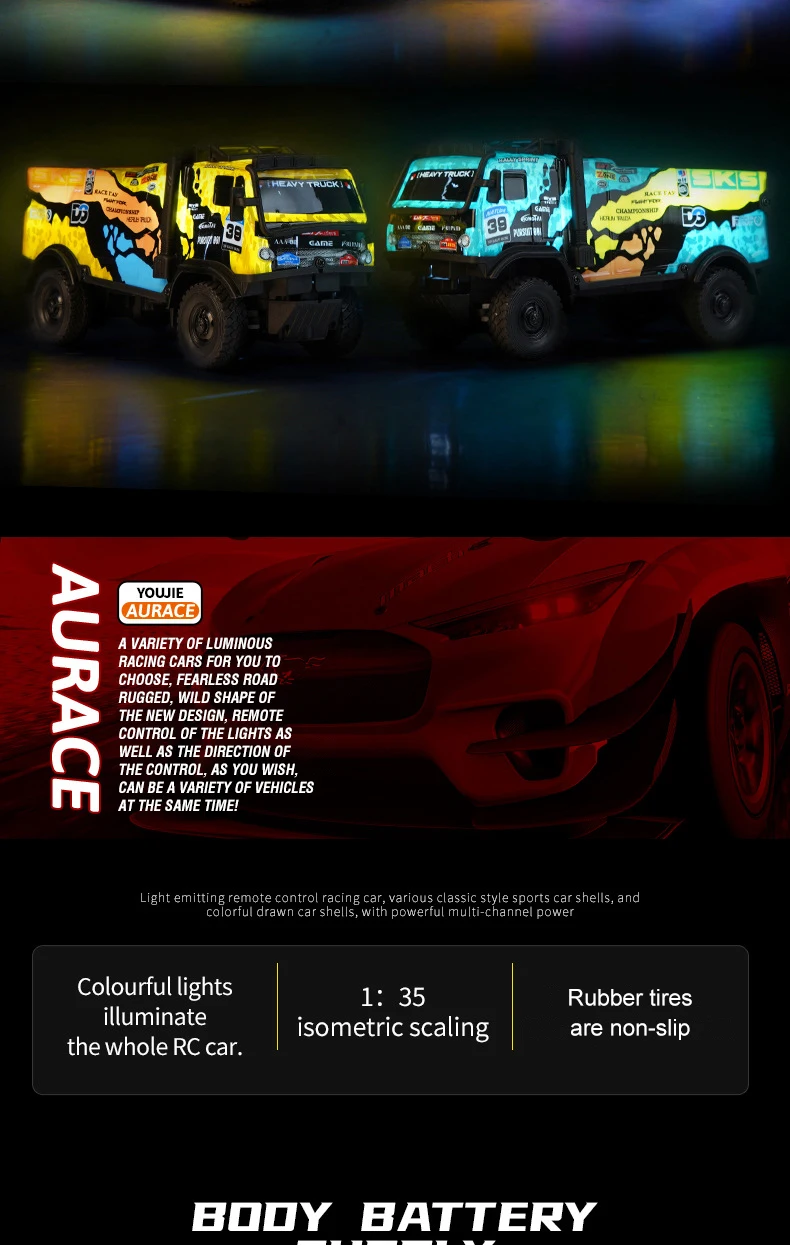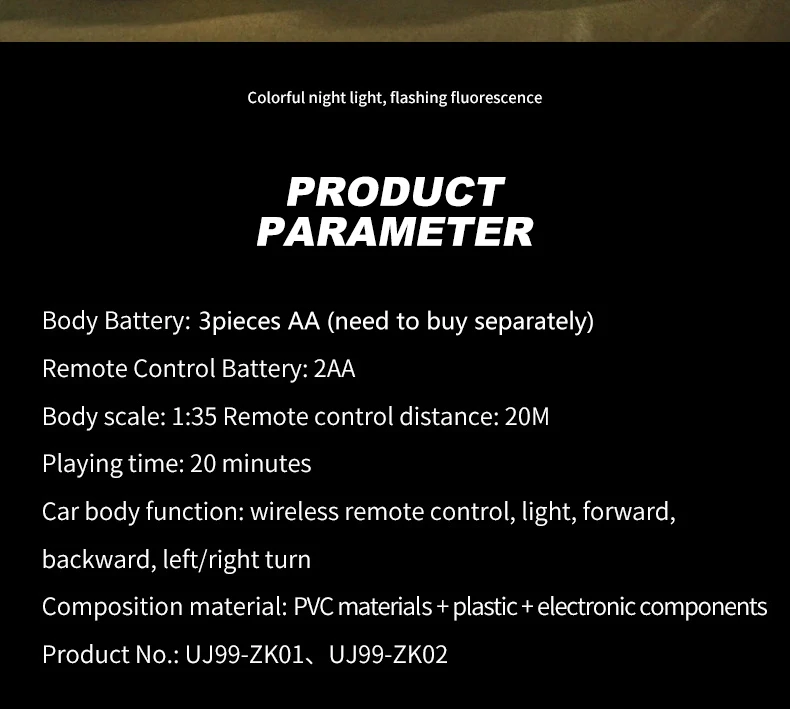 body :car shell: PET, car shell printing process screen printing, wheel TPR, car bottom AB, PP, remote control AB, antenna hose PVC