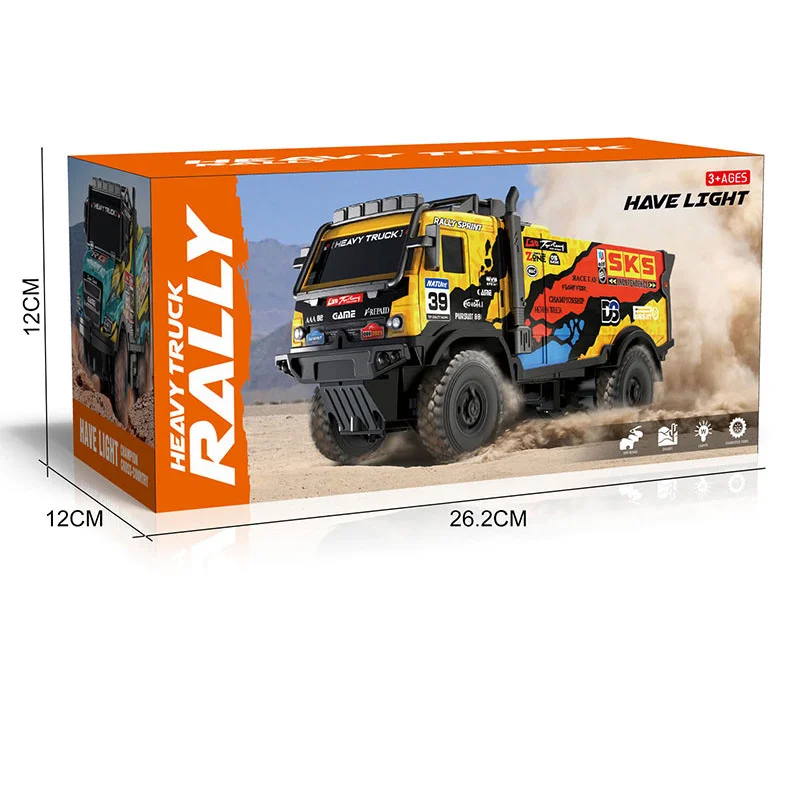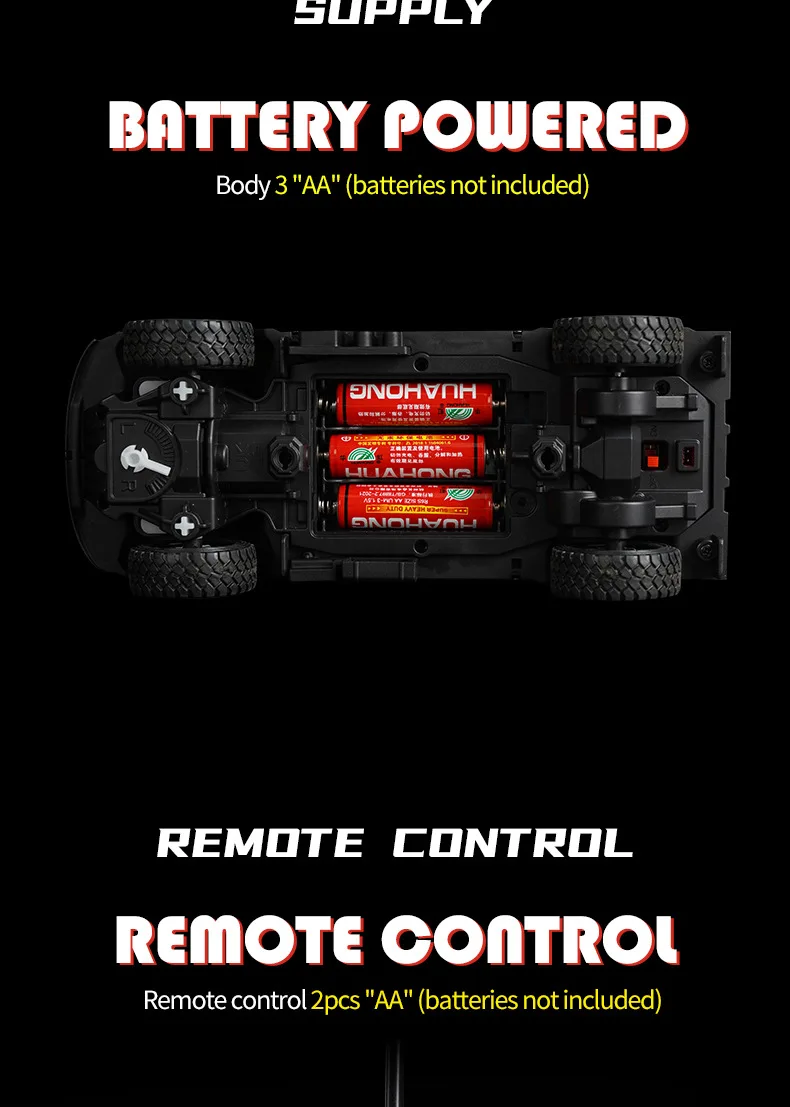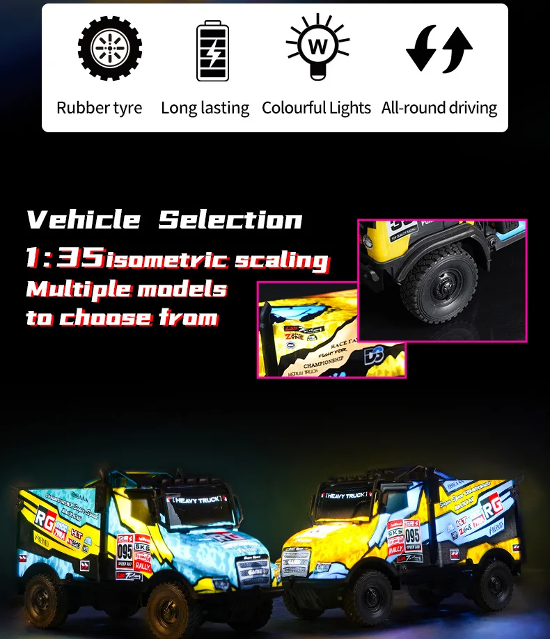 remote control distance of 25 meters, speed of 10 KM/H, lights, forward, backward, turn left, turn right.